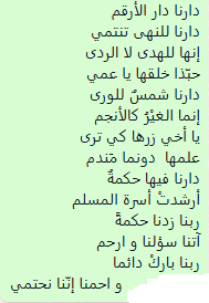 Daru, our fountain of knowledge, connecting to knowledge and wisdom. Our tenet is holding righteousness. Daru is similar to the sun Others, are similar to the stars. My brethren come on board to see The knowledge without any regret, Daru is embedded in wooden Pathfinder to the Muslim Ummah. Oh Allah skyrocket our wisdom, Ratify our prayers with blessings, Oh Allah bless us evermore And safeguard as we seek your guidance.
